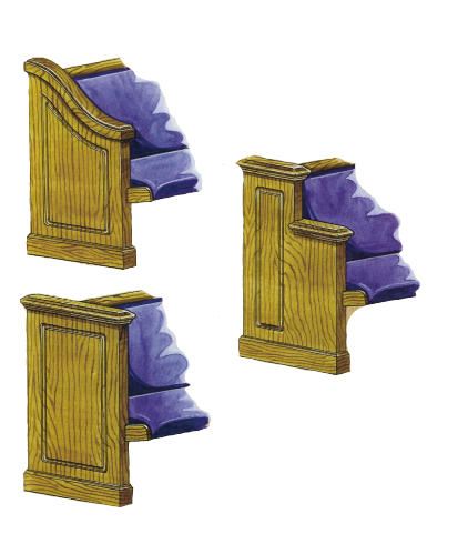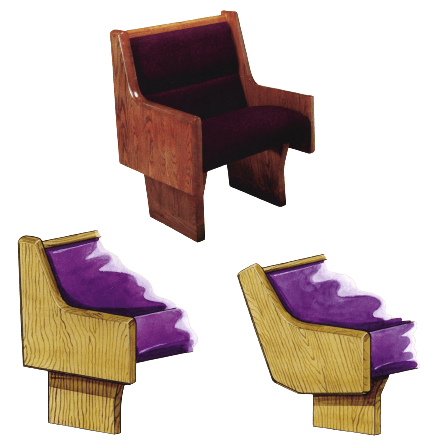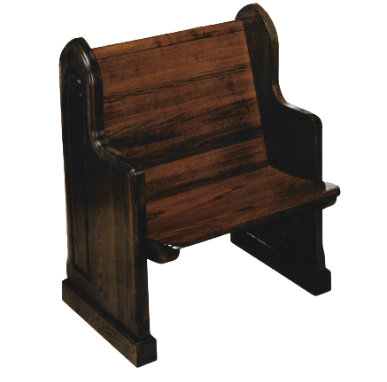 All wood pews. Upholstered pews. Cantilever pews. Colonial pews. Classic pews. Duel end pews. Scroll pews. Traditional pews.