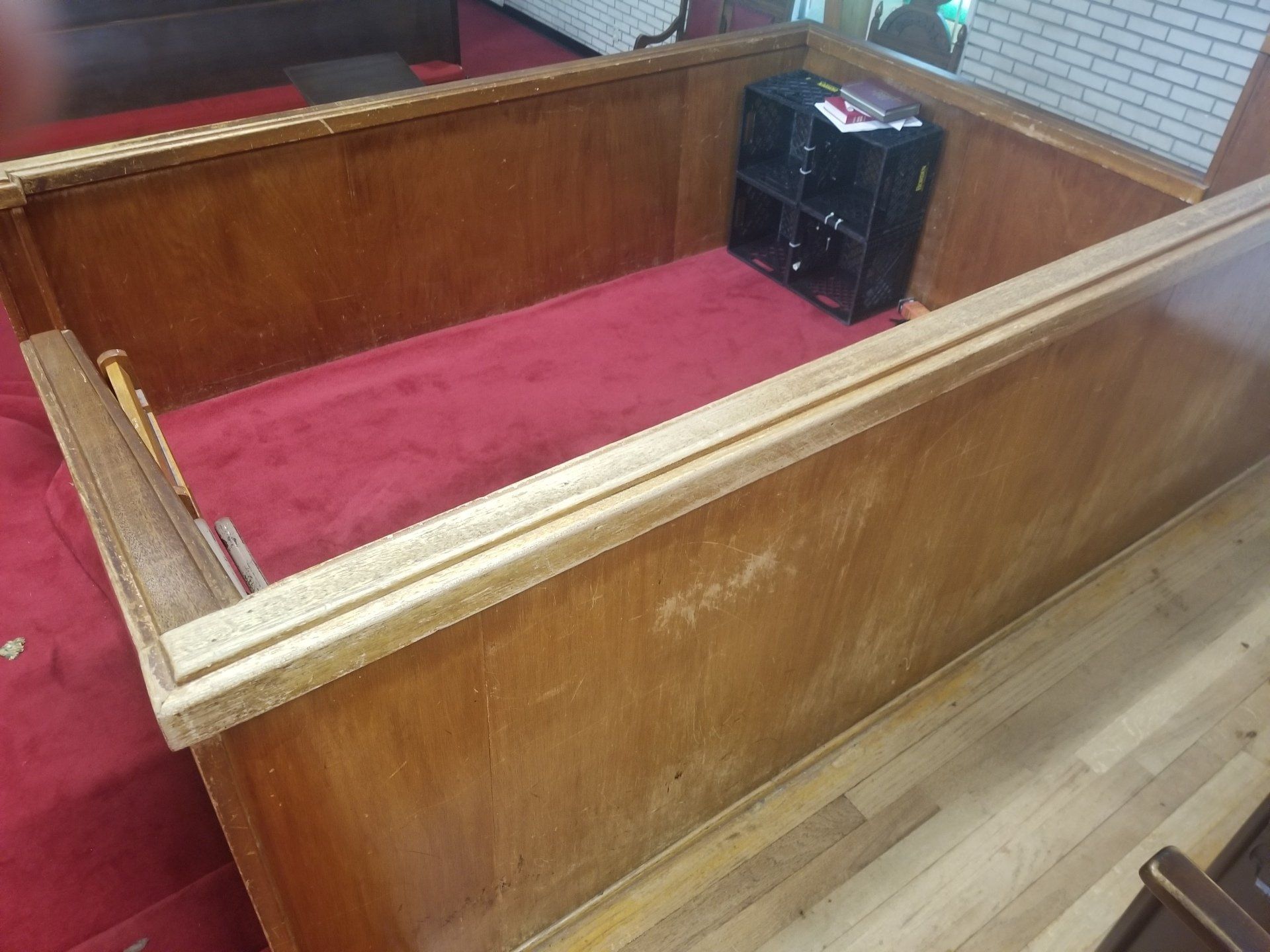 Crossing Community Church is a gym that was turned into a church. They had stack chairs, but wanted something more permanent so they purchased used pews from a church. The pews didn't quite fit the space, so we designed a functioning layout and cut the pews to fit our design. The pews were in excellent condition so no refinishing or refurbishing was needed.