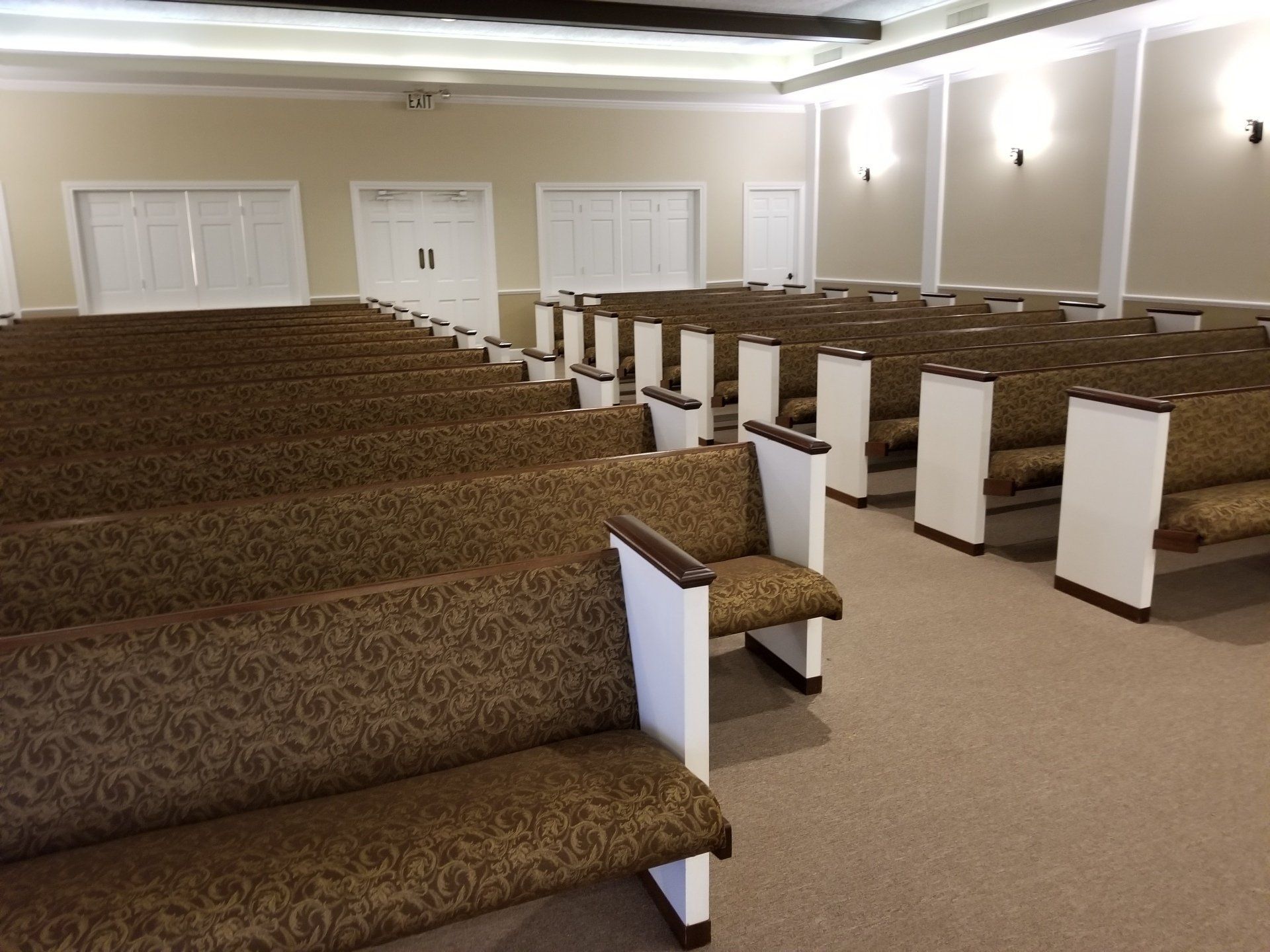 At Mt. Horeb, we refinished and reupholstered their existing pews. We also installed new luxury vinyl tile flooring that looks like hard wood floor.