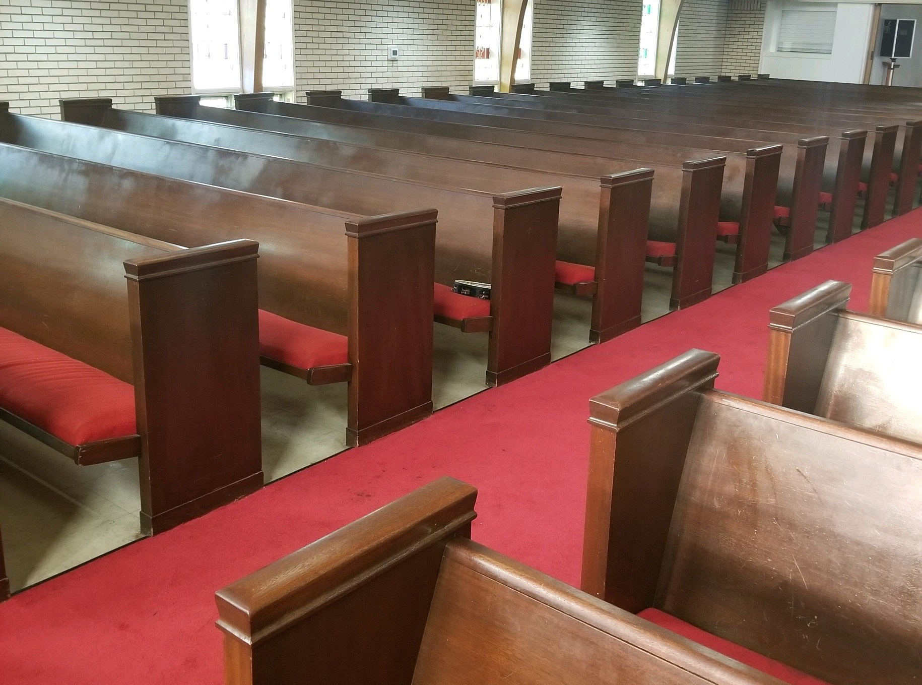 At Mt. Horeb, we refinished and reupholstered their existing pews. We also installed new luxury vinyl tile flooring that looks like hard wood floor.